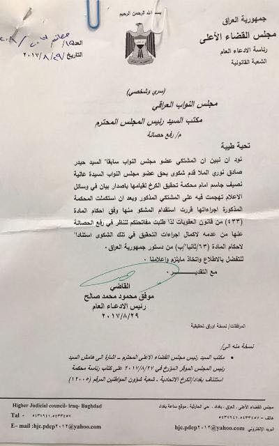 واشارت الوثيقة منها ان "الملا قدم شكوى بحق نصيف، أمام محكمة تحقيق الكرخ لقيامها بإصدار بيان على وسائل الاعلام، تهاجم فيه المشتكي، الملا".