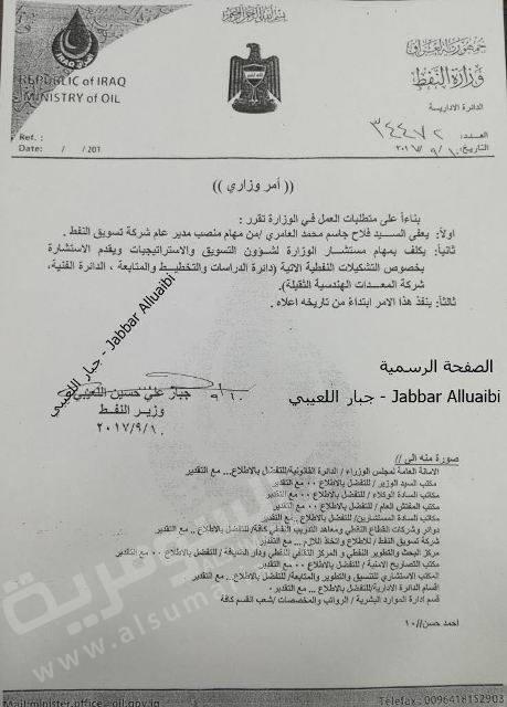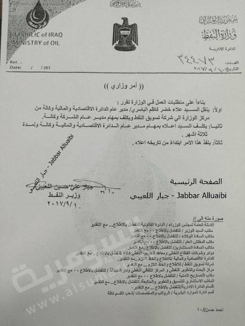 تم نشر وثائق تؤكد تعيين علاء الياسري مديراً لشركة توسيق النفط (سومو) بدلاً من فلاح العامري وتعيين الاخير مستشاراً لشؤون الاستراتيجات.