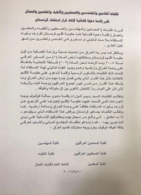 قررت نقابات المحامين والمهندسين والصحفيين والاطباء والمعلمين والعمال إقامة دعوى قضائية ضد حكومة اقليم كردستان لقرارها اجراء الاستفتاء في الخامس والعشرين من ايلول الحالي، عادة القرار "بلا سند قانوني او دستوري".