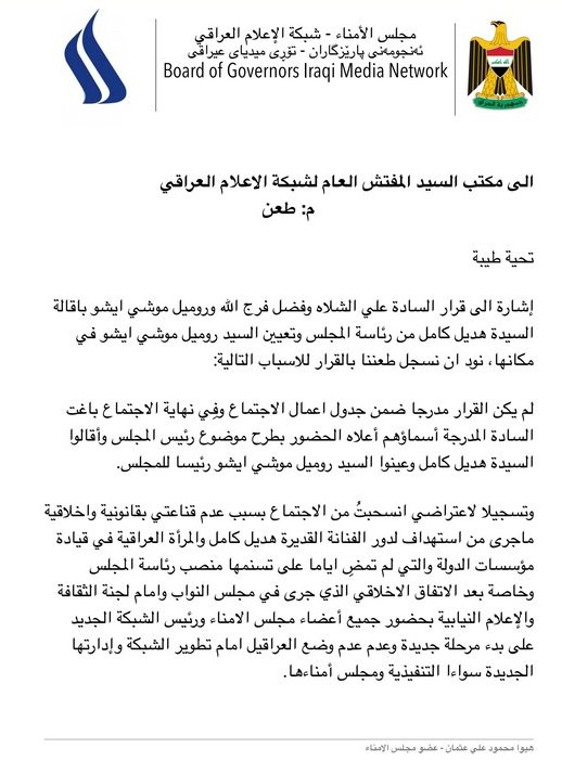 قدم عضو مجلس الامناء في شبكة الاعلام هيوا محمود علي عثمان، الثلاثاء، طعنا بشأن اقالة رئيس مجلس الامناء هديل كامل.