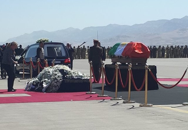 وكان جثمان رئيس الجمهورية السابق جلال الطالباني وصل، اليوم الجمعة (6 تشرين الاول 2017)، الى مطار السليمانية الدولي على متن طائرة قادمة من ألمانيا، وسط حضور رسمي عراقي وإقليمي ودولي.