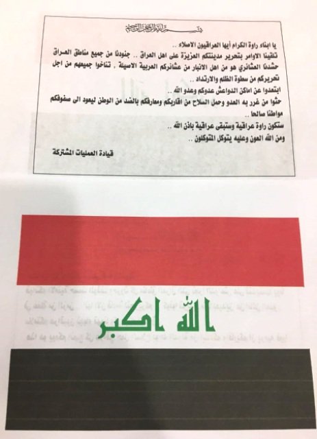 وقالت الخلية في بيان صدر، اليوم، إن "طائرات القوة الجوية العراقية القت، ليلة امس، الآف المنشورات والاعلام العراقية على مدن القائم وراوه"، مبينة أن هذه المنشورات "تتضمن تلقي الأوامر لتحرير مدنهم وتوجيههم بالابتعاد عن مقرات عصابات داعش الارهابية وحث المواطنيين ممن غرر بهم العدو وحملوا السلاح بإلقاء السلاح وترك داعش فورا".