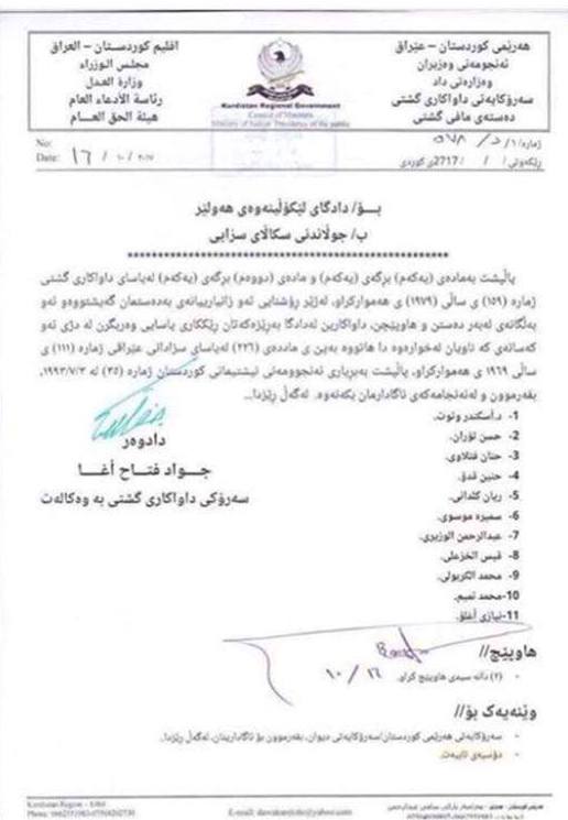 وجاء نص الكتاب المعنون إلى محكمة تحقيق أربيل بتاريخ 16/10/2017 ، تحت عنوان "تحريك دعوى"، "استنادا الى المادة الأولى الفقرة الاولى والمادة الثانية الفقرة الأولى من قانون الادعاء العام المرقم 159 المعدل وفي ضوء المعلومات والوثائق المتوفرة لدينا ندعو من محكمتكم المحترمة إتخاذ الاجراءات القانونية بحق الأشخاص الواردة اسمائهم ادناه وفق المادة 226 من قانون العقوبات العراقي المرقم 111 للعام 1969 المعدل، وإستنادا الى قرار برلمان اقليم كردستان المرقم 35 الصادر في 3/7/1993 تفضلوا .. وإطلاعنا على النتائج".