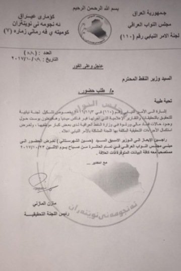 وقال رئيس اللجنة النائب مازن المازني في حديث صحفي ، ان "اللجنة ارسلت كتابا رسميا الى وزير النفط تطلب منه الايعاز الى وزير النفط الاسبق حسين الشهرستاني الحضور الى مجلس النواب يوم امس الموافق الـ23 تشرين الاول 2017"،
