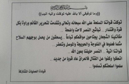 واضافت الخلية ان "100 الف منشور القيت على منطقة اختيلة، و100 الف اخرى على منطقة درجه، و100 الف منشور على منطقة سعدة"، مشيرا الى ان "المنشورات تتضمن توجيهات للمواطنين وتحذيرات للدواعش بالأستسلام وألقاء السلاح او مصيرهم الموت".