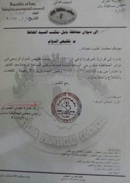 وقال رئيس المجلس رعد الجبوري في حديث صحفي ان "مجلس محافظة بابل قرر تقليص الدوام الرسمي لغاية الساعة الواحدة من بعد الظهر واعتبارا من يوم الثلاثاء المقبل الموافق الـ٣١ من تشرين الاول الحالي".