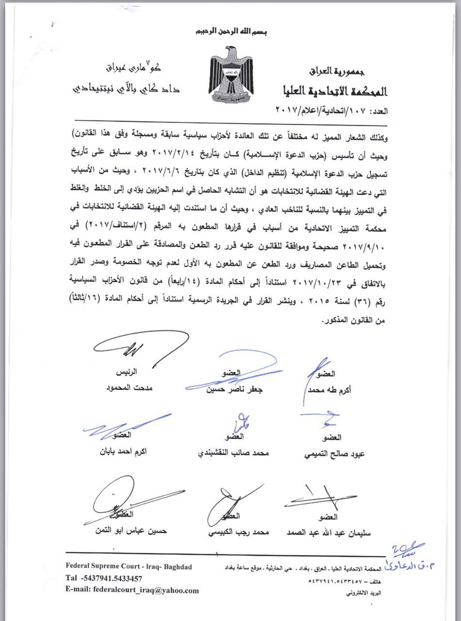 وبحسب وثيقة صادرة من المحكمة تبين ان الهيئة القضائية للانتخابات في محكمة التمييز الاتحادية اصدرت قراراً يقضي بإلزام مفوضية الانتخابات بشطب تسجيل حزب الدعوة الإسلامية/ تنظيم الداخل، واختيار اسماً بديلاً لا يحتوي على أي مفردة من المفردات المكونة لحزب الدعوة الإسلامية.