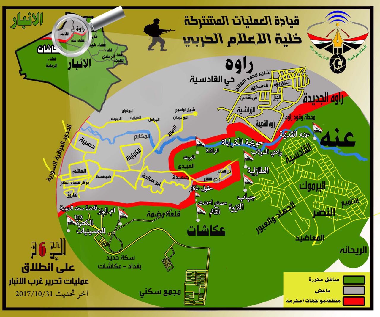 نشرت خلية الاعلام الحربي، اليوم الثلاثاء، خارطة للعمليات العسكرية غرب الانبار، تظهر تقدم القوات المشتركة بشكل لافت في عمليات التحرير، باليوم السادس من انطلاقها.