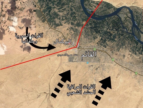 وتقدمت القطعات العراقية في محور القائم الحدودي يوازيها تقدما واسعا للقوات السورية في المناطق الحدودية تمهيدا للالتحام وتأمين الخط الدولي العراقي السوري غرب القائم.