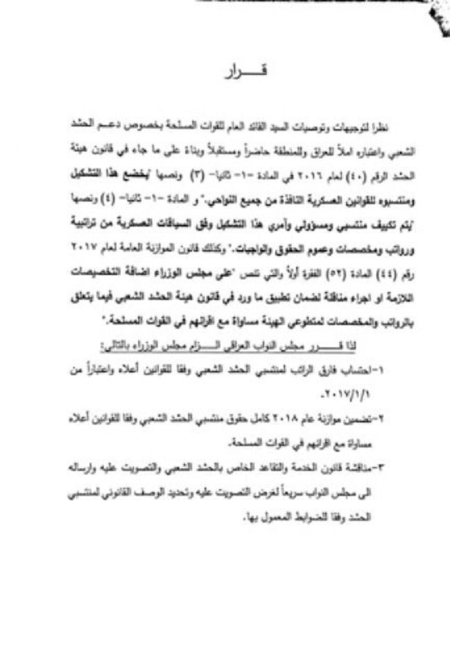 نص قرار البرلمان الخاص رواتب ومخصصات الحشد الشعبي، والذي صوت عليه خلال جلسته التي عقدت اليوم.