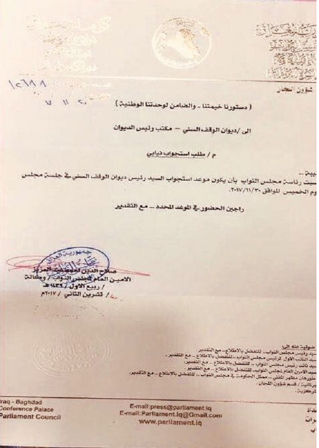 اصدرت رئاسة مجلس النواب موعدا تحدد فيه يوم الخميس 2017/11/30 لاستجواب رئيس ديوان الوقف السني عبداللطيف الهميم.