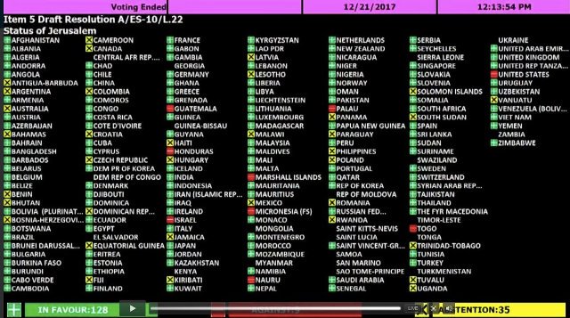 صوتت 128 دولة في الجمعية العامة للأمم المتحدة خلال جلسة طارئة، ضد اعتراف الرئيس الأمريكي دونالد ترامب بالقدس عاصمة لإسرائيل، فيما امتنعت 35 دولة عن التصويت، وعارضت القرار 9 دول.