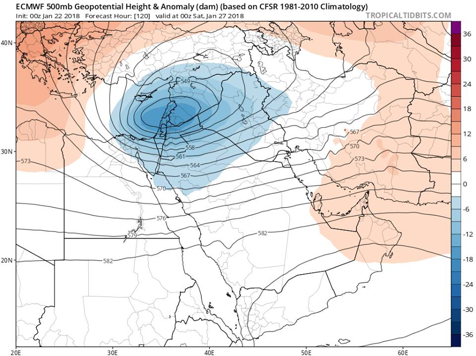 ونشر المنبئ الجوي خارطة توضح المنخفض القطبي في طبقات الجو العليا متمركز على بلاد الشام يوم السبت المقبل.