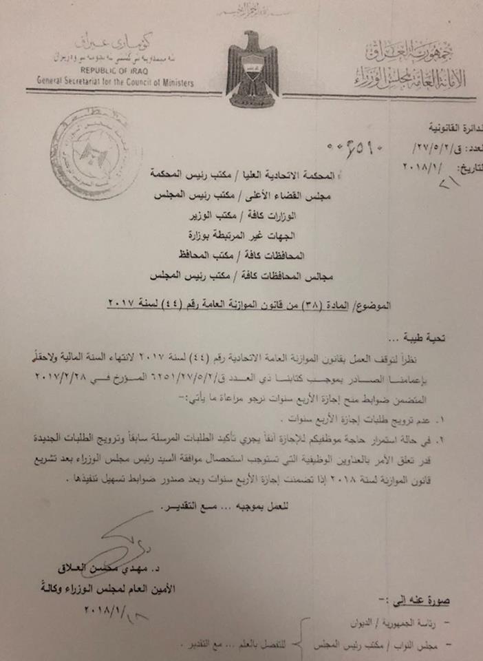 تنشر وكالة انباء براثا وثيقة صادرة عن الأمانة العامة لمجلس الوزراء، تفيد بانها أوقفت ترويج إجازة الـ 4 سنوات بعد توقف العمل بقانون الموازنة العامة الاتحادية رقم (44) لعام 2017.