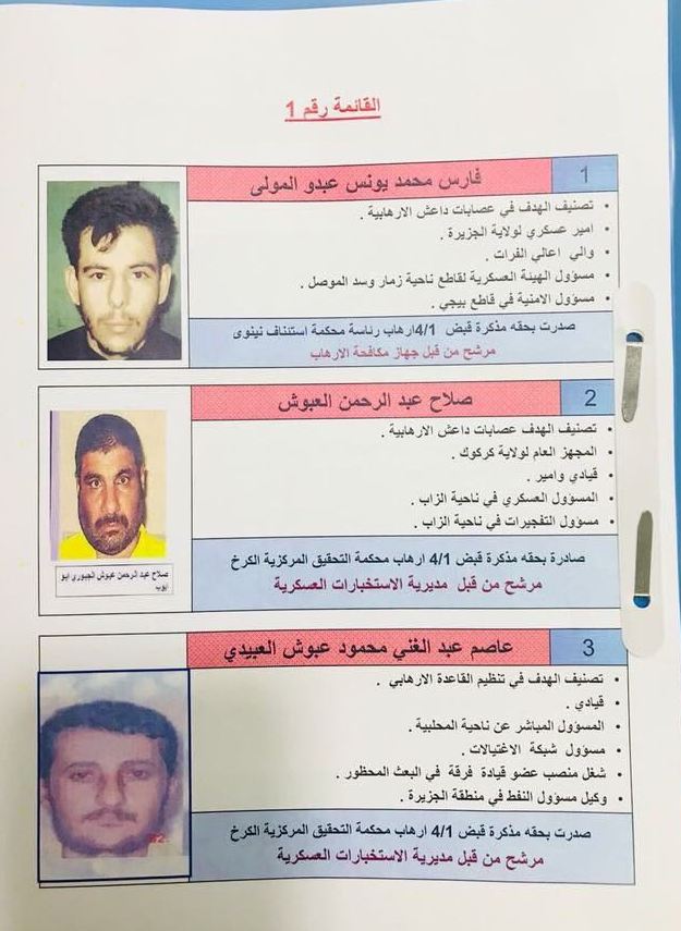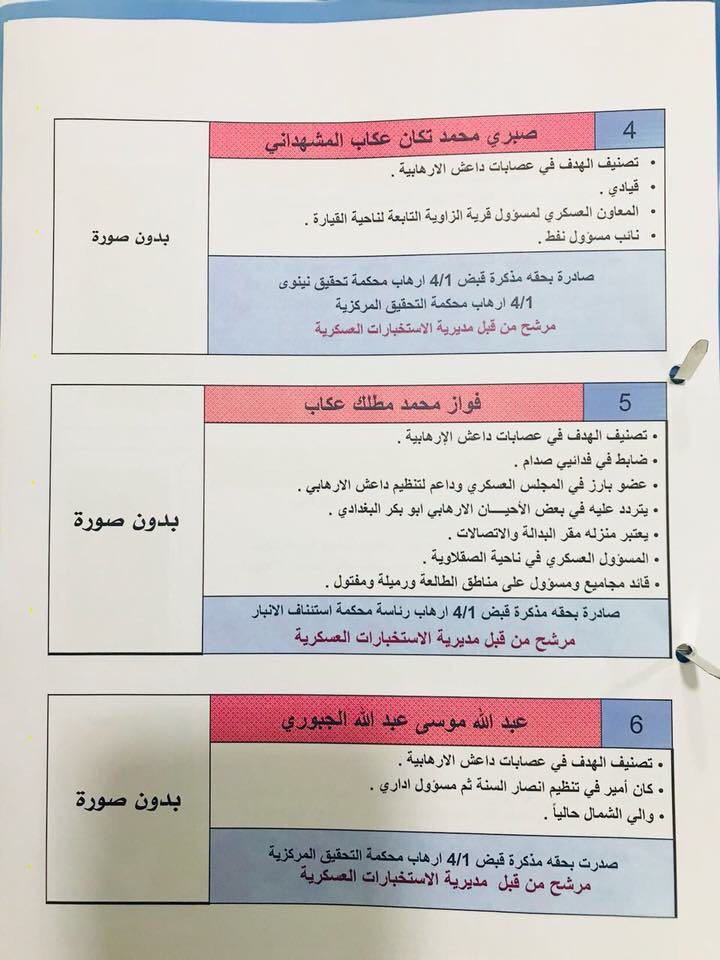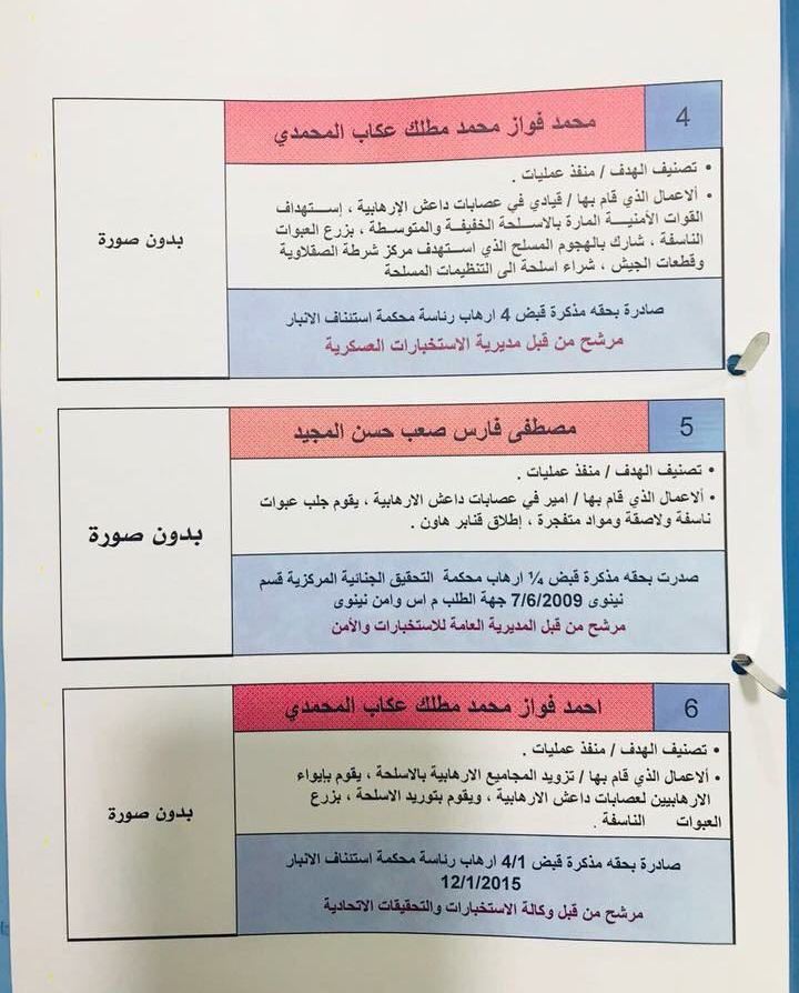 تنشر وكالة انباء براثا بالوثائق اسماء اهم المطلوبين للسلطات العراقية والذين صدرت بحقهم قائمة اليوم الاحد، بحسب مصدر امني.