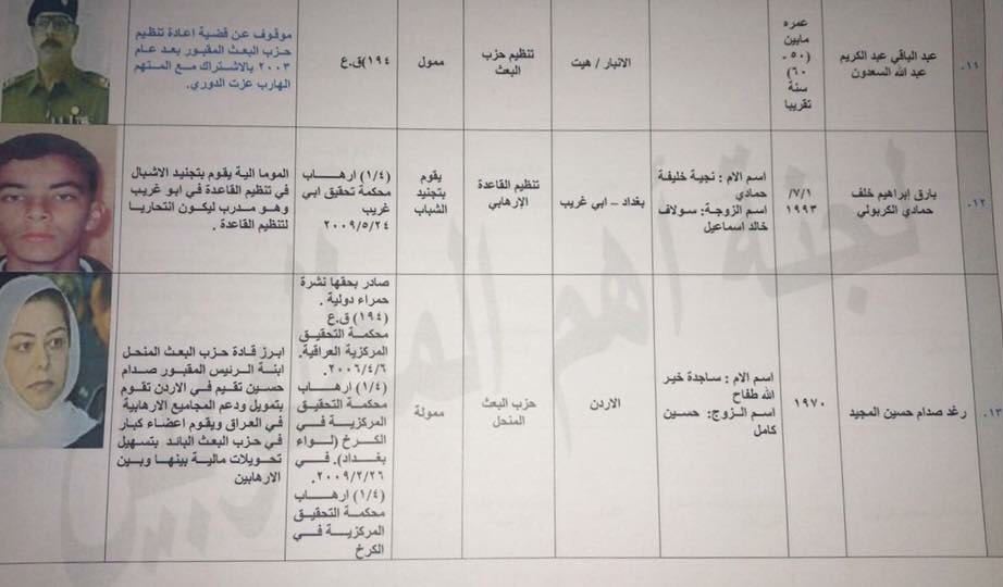 وكان مصدر امني أفاد، اليوم الأحد، بأن السلطات العراقية أصدرت قائمة جديدة بـ60 مطلوباً بينهم ابنة رئيس النظام السابق رغد صدام حسين.