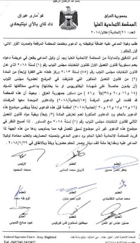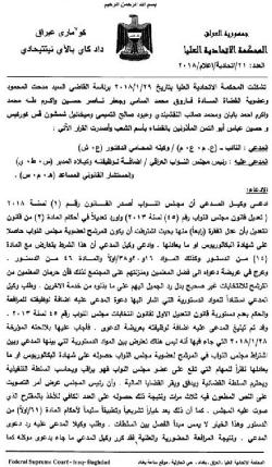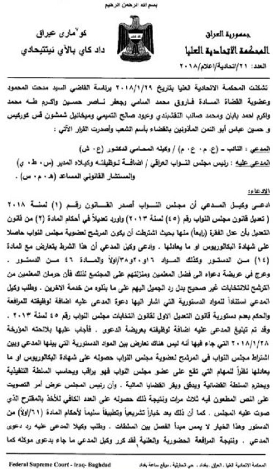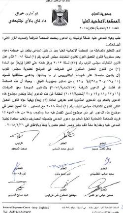 تنشر وكالة انباء براثا قرارا صادر من المحكمة الاتحادية والذي ردت فيه طعنا جديدا من احد النواب على فقرة الشهادة لمرشحي الانتخابات.