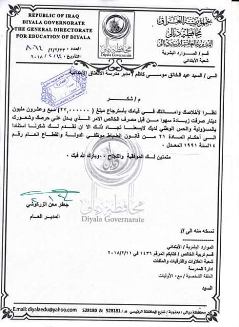 وقال مدير اعلام تربية ديالى سنان الربيعي في حديث صحفي إن "مدير مدرسة ابتدائية في قضاء الخالص (15كم شمال بعقوبة) قام بإعادة 27 مليون دينار صرفت سهوا من قبل مصرف حكومي".