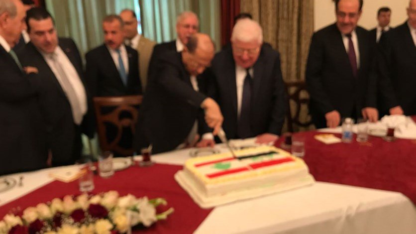 وقام معصوم بتقديم قالب حلوى يمثل علمي لبنان والعراق في نهاية الغذاء.