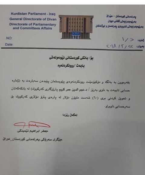 واضافت "وبعد متابعة دقيقة من بعض نواب اللجنة المالية في برلمان كردستان تبين ان المبلغ مودع في بنك كوردستان في أربيل "، مشيرة الى ان "المضحك هو ان رئيس برلمان كردستان خاطب في الـ22 من شباط الحالي، البنك أعلاه، الا ان الاخير وبسرعة البرق رد في نفس اليوم البرلمان بالقول انه لايوجد عندهم حساب باسم نجم الدين، حيث جاء الرد يوم الخميس والذي كان نصف دوام".