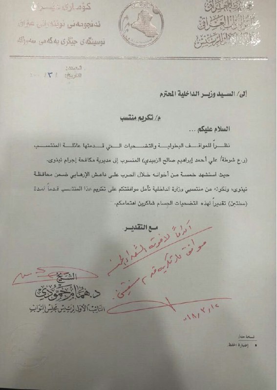 واشار الشيخ حمودي في طلبه الرسمي الى ان التكريم هو تثمينا للمواقف البطولية للمنتسب المذكور بتقديمه خمسة من اشقائه شهداء خلال الحرب مع داعش الارهابي