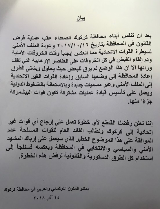 عبرت الأطراف والجهات السياسية العربية والتركمانية في كركوك يوم السبت عن رفضها بتشكيل غرفة عمليات مع قوات البيشمركة، وعودتها داخل المحافظة.