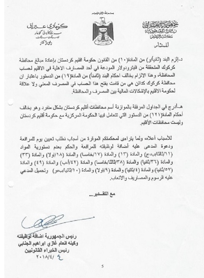 وحددت الوثائق، تلك الخروقات في موازنة 2018، وطلبت من المحكمة الاتحادية النظر فيها واعتبارها نصوص تخالف الدستور.