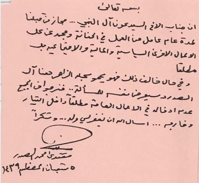 وقال الصدر في بيان ان عون آل النبي مجاز لمدة عام كامل من العمل في الحنانة ومجمد عن كل الاعمال السياسية والاجتماعية والمالية، مؤكدا انه في حال خالف ذلك فانه سيمحو سجله مع التيار الصدري وسيعرض نفسه للمساءلة.