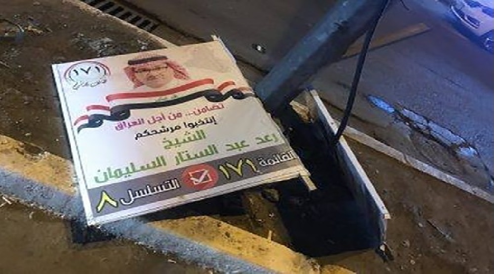 وتظهر بعض الصور قيام مواطنين بتمزيق وإزالة اللوحات الإعلانية للمرشح السليمان، الذي عرف بتهجمه المستمر على الجيش العراقي والحشد الشعبي ، فضلا عن دعوته لانشاء حلف مع تنظيم داعش الإرهابي “.