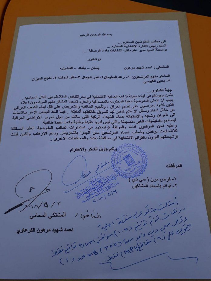 وكان المحامي شهيد تقدم في الثالث من ايار الحالي بشكوى إلى مفوضية الانتخابات لاستبعاد الاسماء الخمسة المذكورة، وذلك بتهمة “دعم الإرهاب” و”التحريض الطائفي” عبر وسائل الإعلام ومواقع التواصل الاجتماعي.