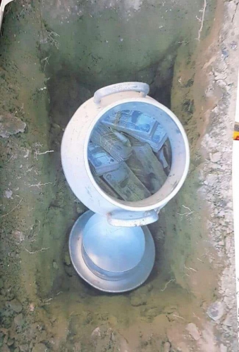 وأضاف" حيث تم القبض على هذا الارهابي وبعد البحث والتحري في داره عثر على مبلغ مالي مقداره [43] مليون دينار مخبأة داخل إناء حليب فارغ محكم الإغلاق مدفون تحت الأرض، في قرية الجماسة منطقة بادوش غرب مدينة الموصل".