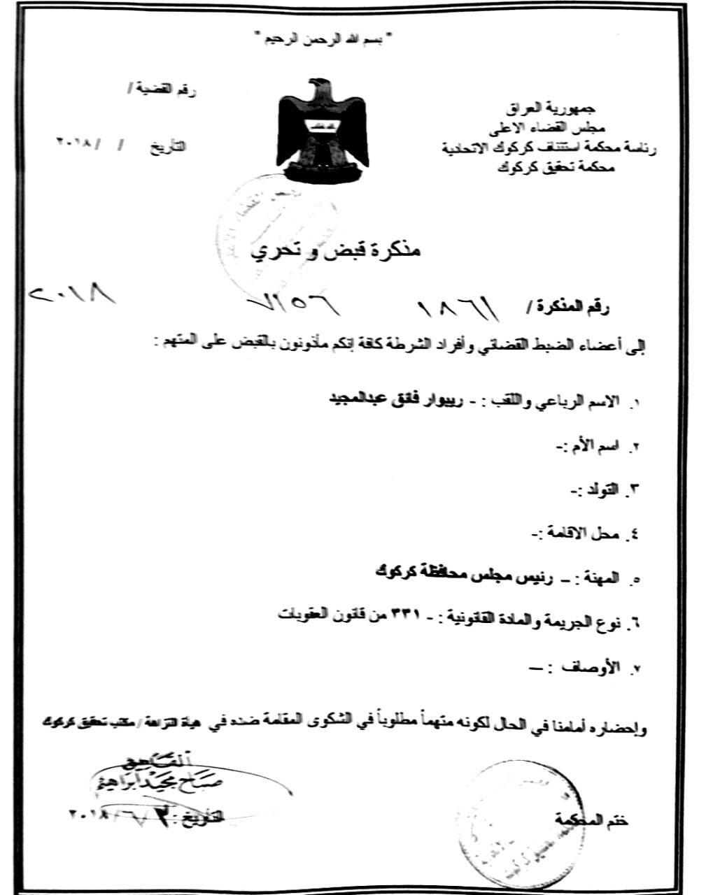 وقال المصدر ، إن "مذكرة قبض اصولية صدرت بحق رئيس مجلس محافظة كركوك بالوكالة ريبوار فائق عبد المجيد وفق المادة 331 من قانون العقوبات".