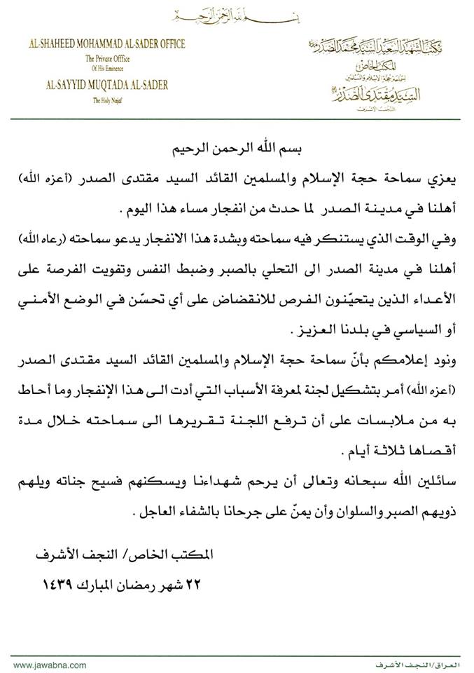 وبحسب البيان فإن الصدر "أمر بتشكيل لجنة لمعرفة الأسباب التي أدت الى هذا الانفجار، وما أحاط به من ملابسات على ان ترفع اللجنة تقريرها اليه خلال مدة أقصاها ثلاثة أيام".