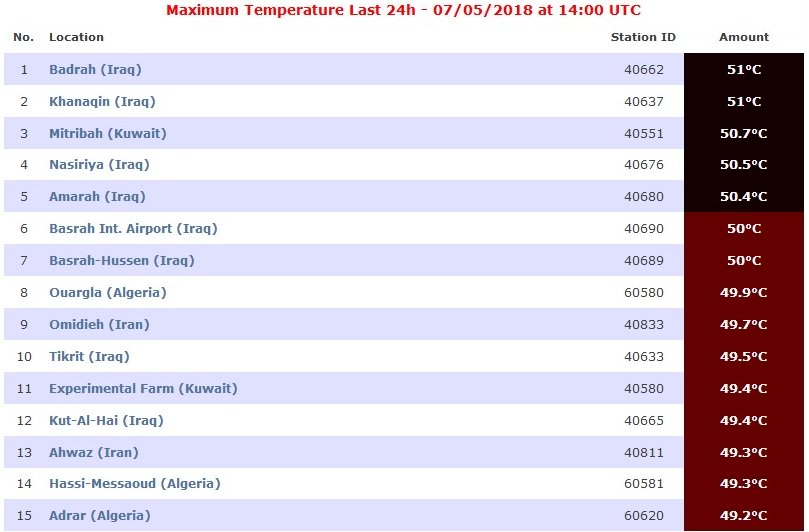 ونشرت محطة "بلاسيرفيلي" في كاليفورنيا الأمريكية، جدولا بأعلى درجات الحرارة في العالم، والتي بينت أن ثمان مدن عراقية من أصل 15 مدينة مدرجة بالجدول احتلت مراكز الأعلى بدرجات الحرارة بالعالم.