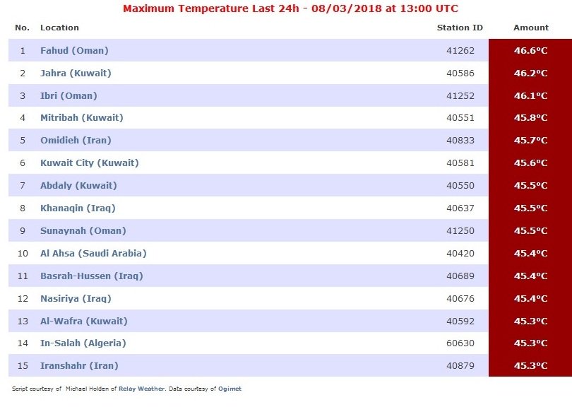 ونشرت محطة "بلاسيرفيلي" في كاليفورنيا الأمريكية، جدولا بأعلى درجات الحرارة في العالم، والتي بينت أن ثلاث مدنية عراقية من أصل 15 مدينة مدرجة بالجدول احتلت مراكز الأعلى بدرجات الحرارة في العالم وهي البصرة وخانقين والناصرية