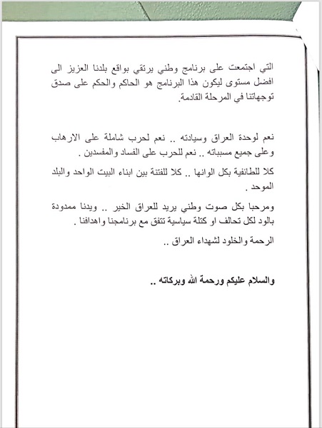 واشار التحالف في بيانه ان يده ممدودة لكل تحالف او كتلة سياسية تتفق مع برنامجه واهدافه .