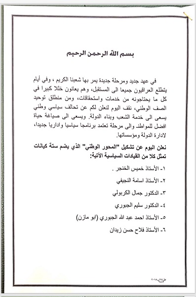 اعلن اليوم تشكيل تحالف {المحور الوطني} بقيادة جماعية يضم 6 شخصيات سنية .