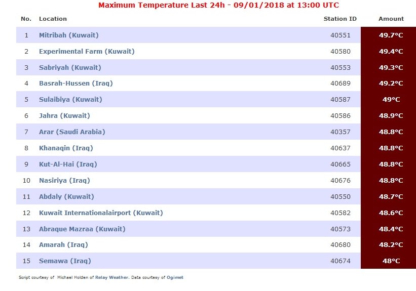 ونشرت محطة "بلاسيرفيلي" في كاليفورنيا الأمريكية وهي محطة عالمية معنية بالأنواء الجوية، جدولاً بأعلى درجات الحرارة في العالم، والتي بينت أن ست مدن عراقية من أصل 15 مدينة مدرجة بالجدول احتلت مراكز الأعلى بدرجات الحرارة.