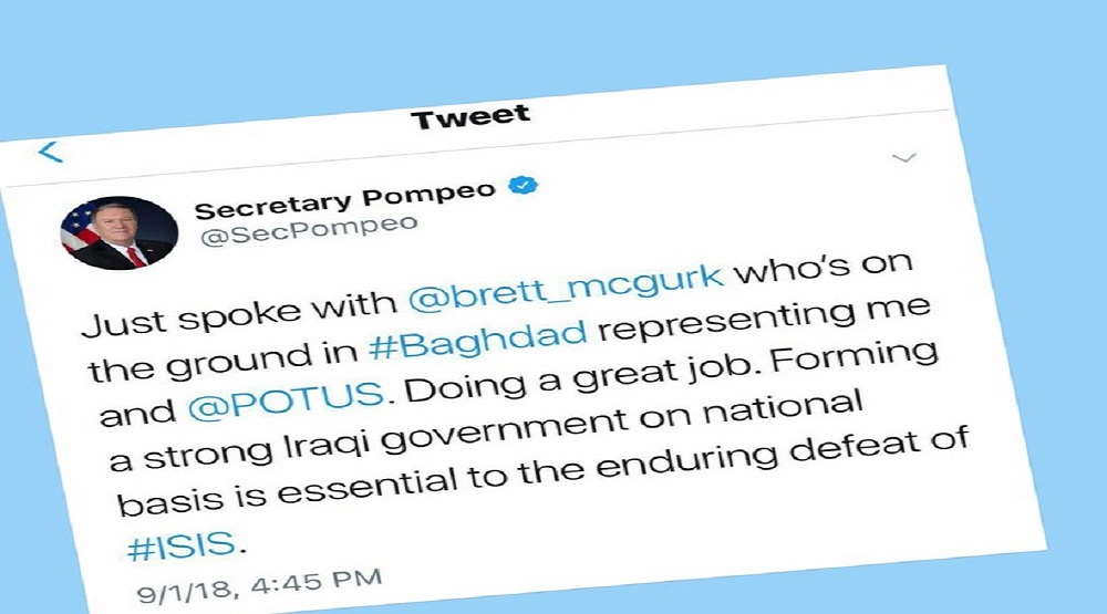 جاء ذلك في تغريدة له على شبكة التواصل تويتر قال فيها " تكلمت قبل قليل مع برت "يقصد المبعوث الامريكي في بغداد " وهو موجود على الارض في بغداد وهو يمثلني ويمثل رئيس الولايات المتحدة ويقوم بعمل عظيم.