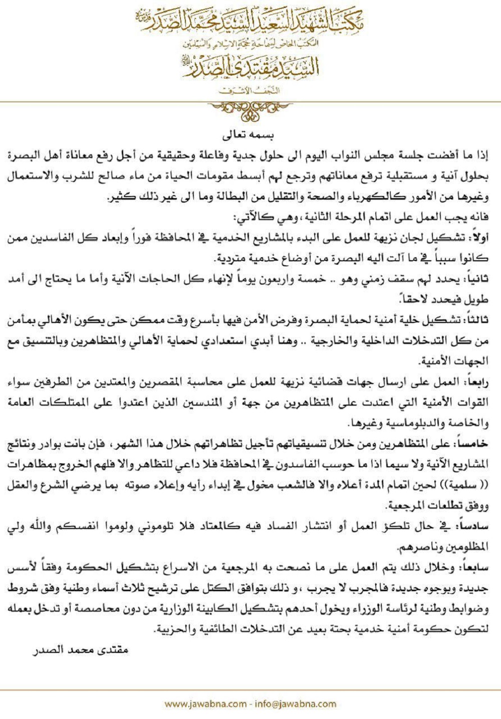 وضع زعيم التيار الصدري مقتدى الصدر خارطة طريق لحل مشكلة البصرة وتشكيل الحكومة العراقية القادمة وحدد ذلك بنقاط خطوات المرحلة الثانية المتعين اتخاذها من قبل مجلس النواب العراقي والمتعلقة بتوفير الخدمات الضرورية كافة لأهالي البصرة واستتباب الامن فيها والعمل على تشكيل حكومة وطنية وفق ما نصت عليه المرجعية وبعيداً عن المحاصصة , جاء ذلك في بيان له بهذا الشان .