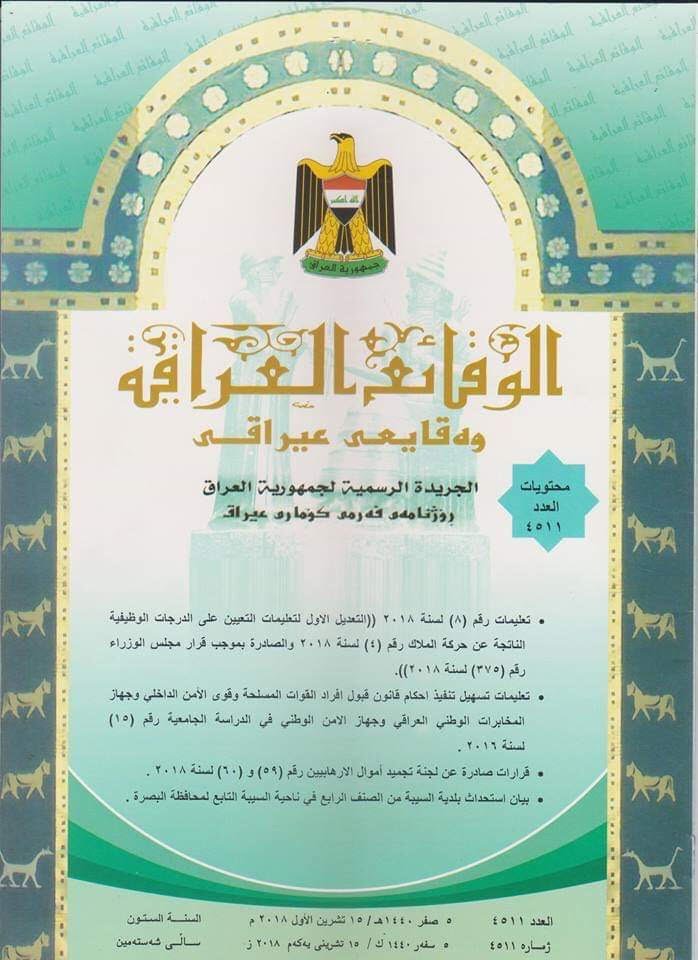 وتابع، أن "العدد تضمن قرارات صادرة عن لجنة تجميد أموال الإرهابيين رقم (59) و(60) لسنة 2018, بالإضافة إلى صدور بيان استحداث بلدية السيبة من الصنف الرابع في ناحية السيبة التابع لمحافظة البصرة".