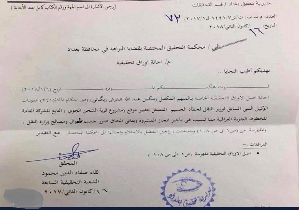 وذكرت المديرية في الوثيقة الصادرة بتاريخ 16 كانون الثاني 2017، إنه "تقرر إحالة أصل الأوراق التحقيقية الخاصة بالمتهم المكفل (بنكين عبد الله خدرش ريكاني)، الوكيل الفني السابق لوزير النقل، الى محكمة التحقيق المختصة بقضايا النزاهة في محافظة بغداد، بسبب الخطأ الجسيم الذي ارتكبه بتغيير موقع (مشروع قرية الشحن الجوي) التابعة للشركة العامة للخطوط الجوية العراقية مما تسبب في تأخير انجاز المشروع وبالتالي الحاق ضرر جسيم بأموال ومصالح وزارة النقل".