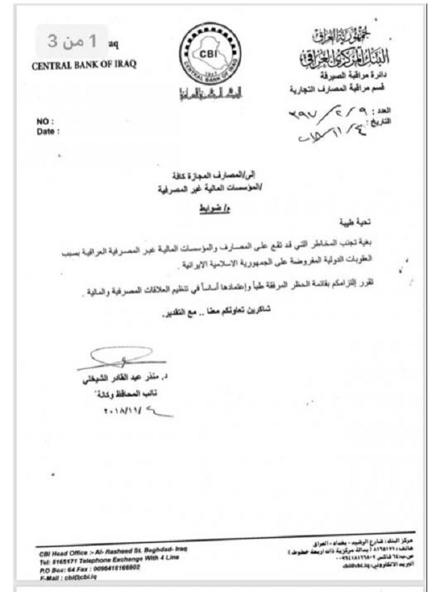 وجاء في وثيقة 'انه تجنبا للمخاطر التي قد تقع على المصارف والمؤسسات المالية غير المصرفية العراقية بسبب العقوبات المفروضة على ايران ، تقرر التزامكم بقائمة الحظر المرفقة طيا واعتمادها اساسا في تنظيم العلاقات المصرفة والمالية .