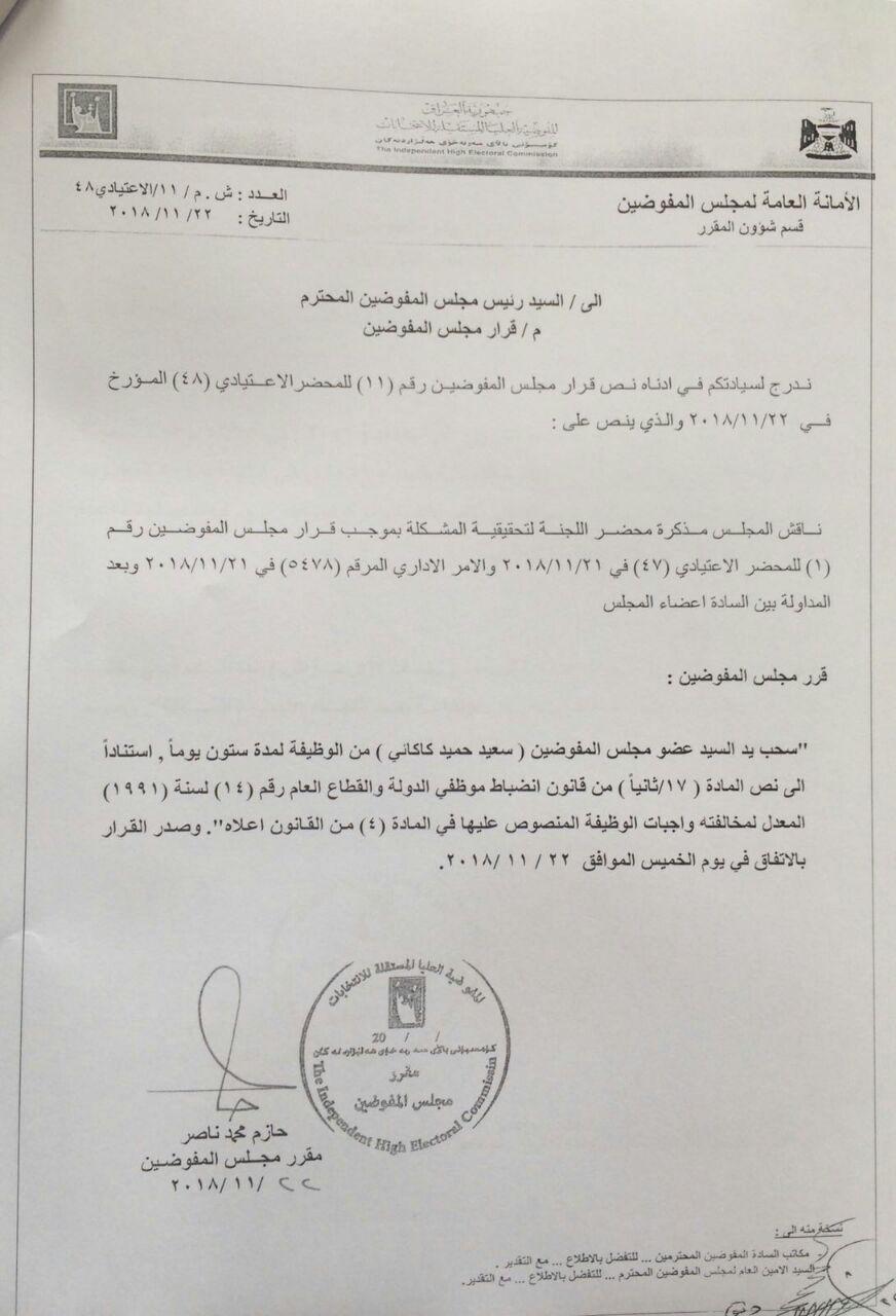 واضافت "سحب يد كاكائي من الوظيفة لمدة ستون يوما , استنادا الى نص المادة ( ۱۷/ثانية ) من قانون انضباط موظفي الدولة والقطاع العام رقم (14) لسنة (۱۹۹۱) المعدل لمخالفته واجبات الوظيفة المنصوص عليها في المادة (4) من القانون الصادر بالاتفاق في يوم الخميس الموافق ۲۰۱۸/ ۱۱ / ۲۲ ".