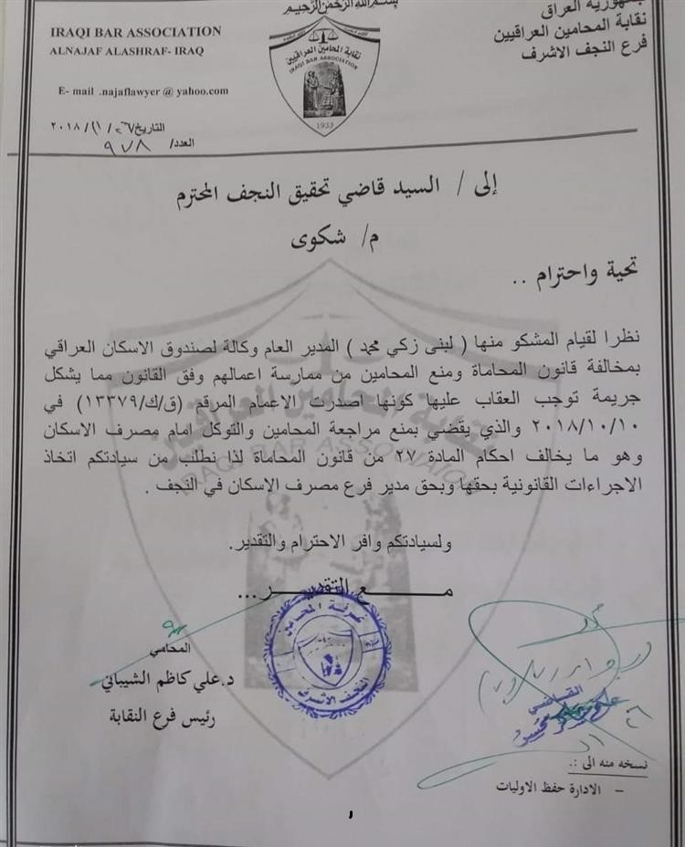 تقدم فرع نقابة المحامين في النجف، اليوم الاثنين، بشكوى ضد المدير العام لصندوق الاسكان وكالة لبنى زكي محمد، لدى قاضي تحقيق النجف، بسبب إصدارها اعماما يقضي بمنع مراجعة المحامين والتوكل امام مصرف الاسكان.