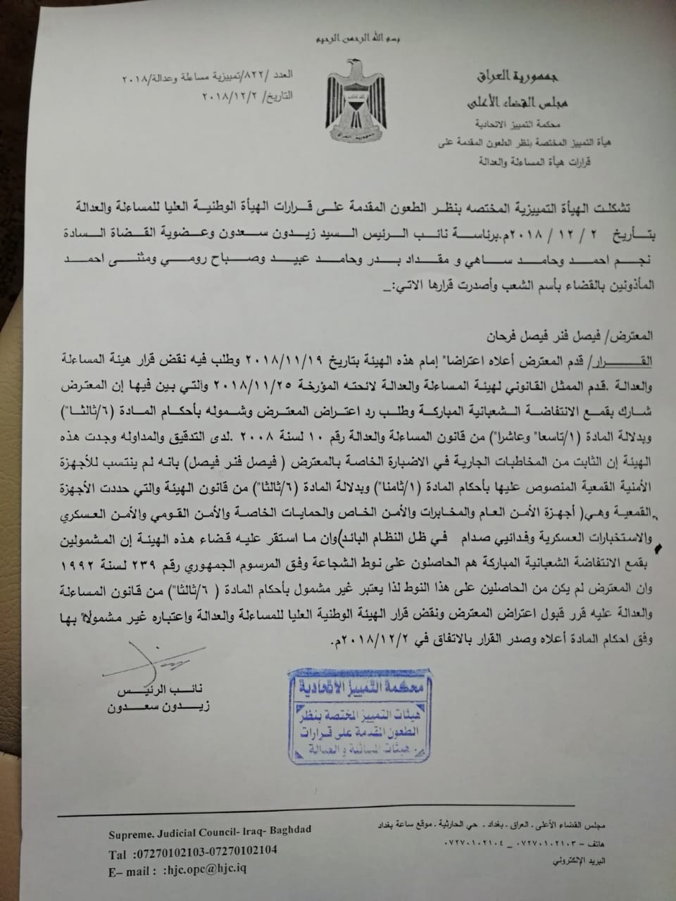 قررت محكمة التمييز، اليوم الأحد، قبول الطعن الذي قدمه المرشح لوزارة الدفاع فيصل الجربا على قرار شموله بإجراءات هيئة المساءلة والعدالة.
