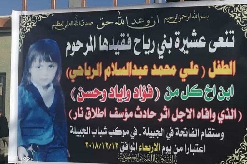 وكان مصدر طبي اعلن امس الأربعاء، مصرع الطفل علي محمد عبد السلام الرياحي نتيجة اصابته بطلق ناري. واشار المصدر الى أن "الضحية وصل متوفيا الى المستشفى بسبب نزاع عشائري مسلح".