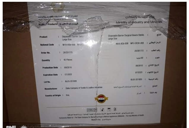 واشار إلى أن "هذه المواد يلصق عليها ليبل محلي، على أنها صناعة عراقية، وتسير الى وزارة الصحة العراقية، لغرض استخدمها في المستشفيات"، مبينا أن "التحقيق لازال مفتوحاً للكشف عن ملابسات الموضوع".