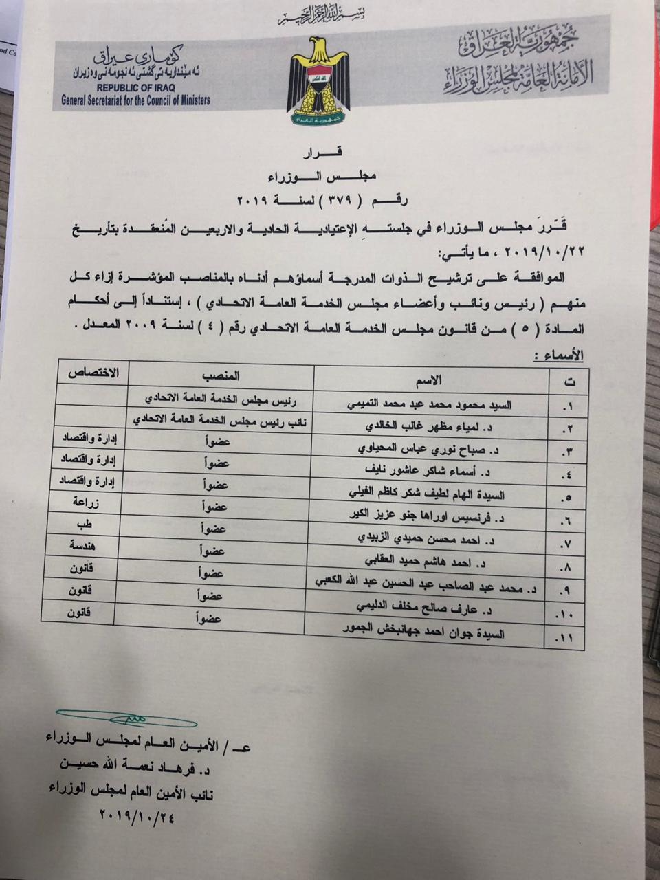 نشرت أسماء رئيس مجلس الخدمة ونائبه والاعضاء الذين صوت عليهم مجلس النواب بجلسة اليوم.
