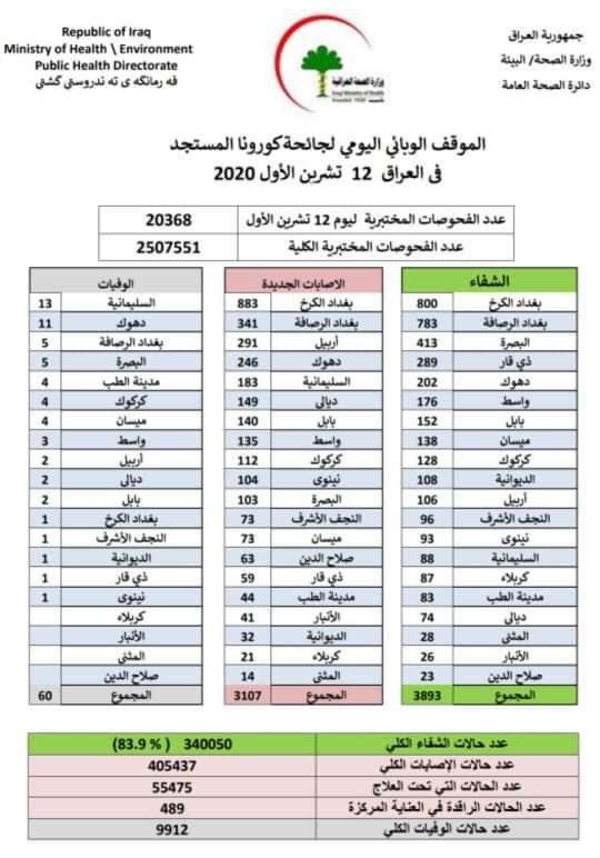 وذكرت الوزارة في بيان أنها "سجلت 3107 إصابة جديدة بفيروس كورونا، فضلاً عن 3893 حالة شفاء، بالإضافة إلى 60 حالة وفاة".
